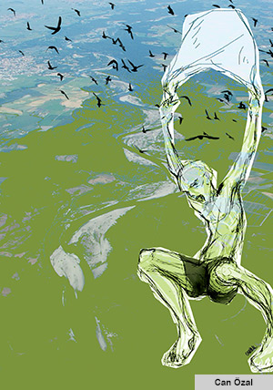 Baktım akşam oluyor, kimseye görünmeden sıvışayım dedim binadan. Daha tam güneş batmadan sahile ulaşmayı başardım. Sanırım daha önceden helikopter pisti olan alan, sanki terk edilmiş bir plajın iskelesi gibi önümde uzanıyor. Kıyıdan uzakta, denizin üstünde ama yapay da olsa ayakları yere basmanın verdiği güvenle en uca gidiyorum. Bizim buralarda okyanus olmadığından ve Marmara dediğin deniz de pek güven vermediğinden öyle tahtalı çocuklar göremezsin. Ama bolca martı, dalgalı denizde yüzeye üşüşen ne olduğu belirsiz balıklar ile uğraşırken o çocuklardan daha sıkı figürler çıkarabiliyorlar. Pençeleri ve gagaları sesleniyor; ‘Benimle, makinem ile konuş.’”